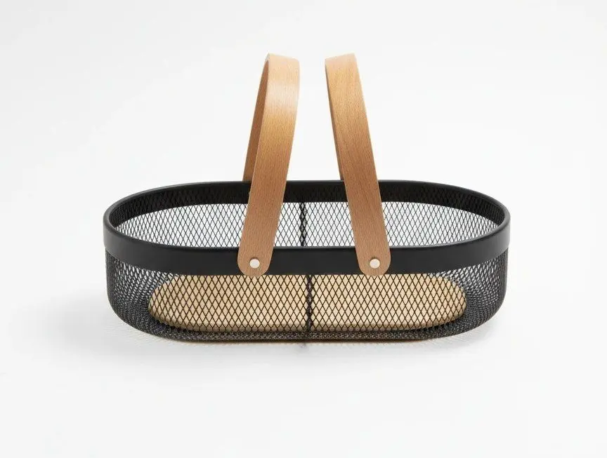 ترکیب متریالهای طبیعی و فلز با فرم تمیز و مینیمال، این سبد را به اکسسوریای زیبا و خوشساخت برای خانه و آشپزخانه بدل کرده است