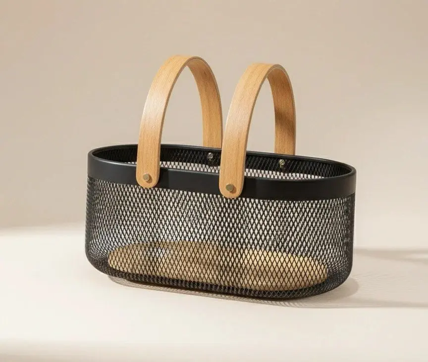🧺 سبد همهکاره فلزی با دسته و کف چوبی آسمان با طراحی لوکس مینیمال، ترکیبی متعادل از فلز مشکی مات و چوب طبیعی هستند. بدنهی فلزی مقاوم با بافت ظریف و کف چوبی گرم، در کنار دستههای چوبی خمیده ظاهری زیبا، کاربردی و هماهنگ با هر سبک دکوراسیون ایجاد میکند.