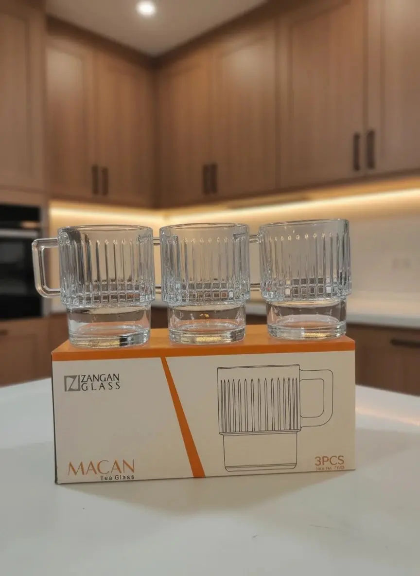 ست لیوان دسته‌دار شیشه‌ای ماکان با طراحی شفاف و شیارهای عمودی ظریف، انتخابی شیک و کاربردی برای استفاده روزمره و پذیرایی است. این لیوان‌ها از شیشه باکیفیت و شفاف ساخته شده‌اند که علاوه بر زیبایی، مقاومت مناسبی در برابر حرارت نوشیدنی‌های گرم دارند.